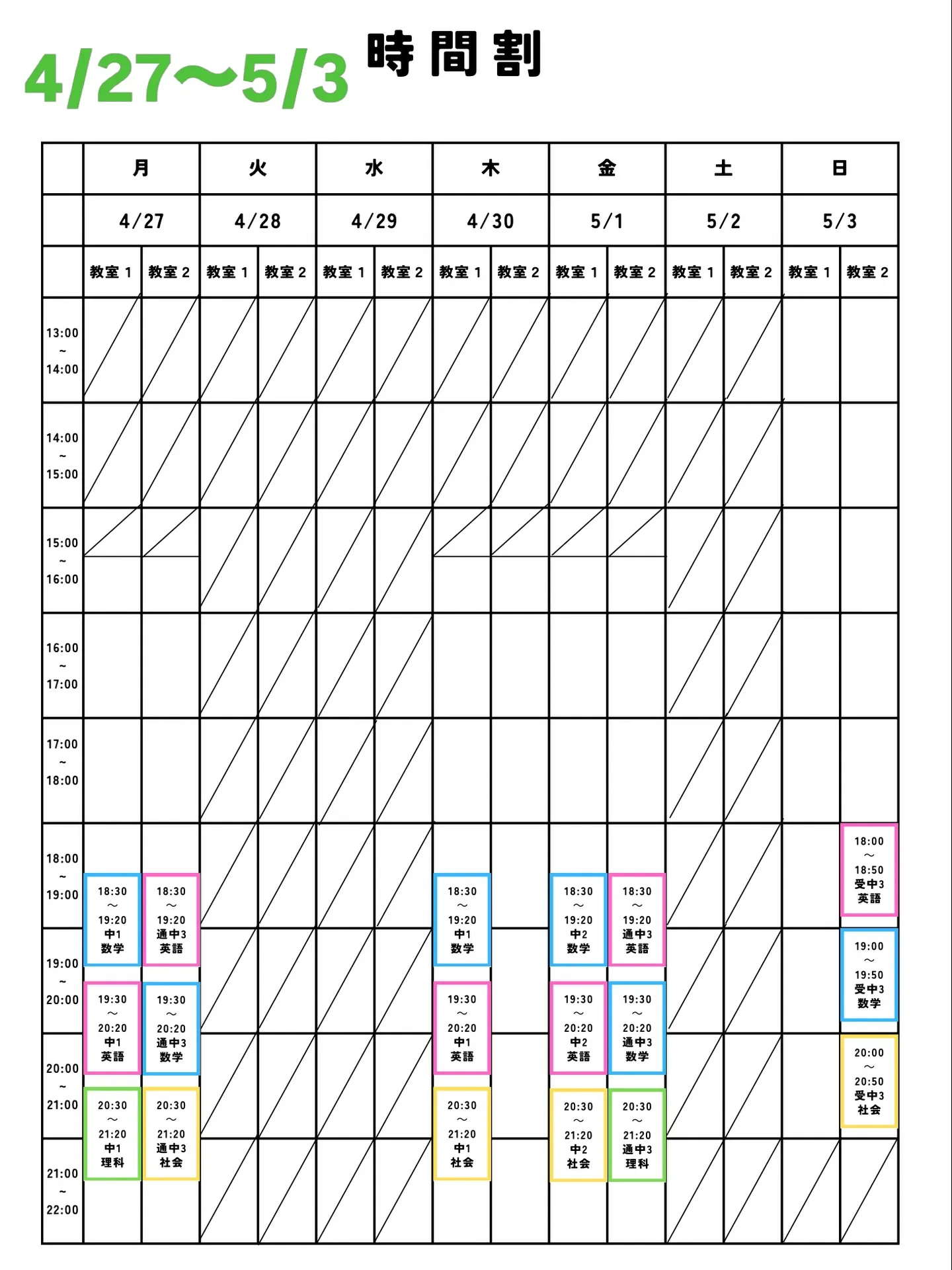 4/27〜の時間割! ⚠️水曜日は祝日のためお休みです! それ以外は通常の定休日、営業日です!